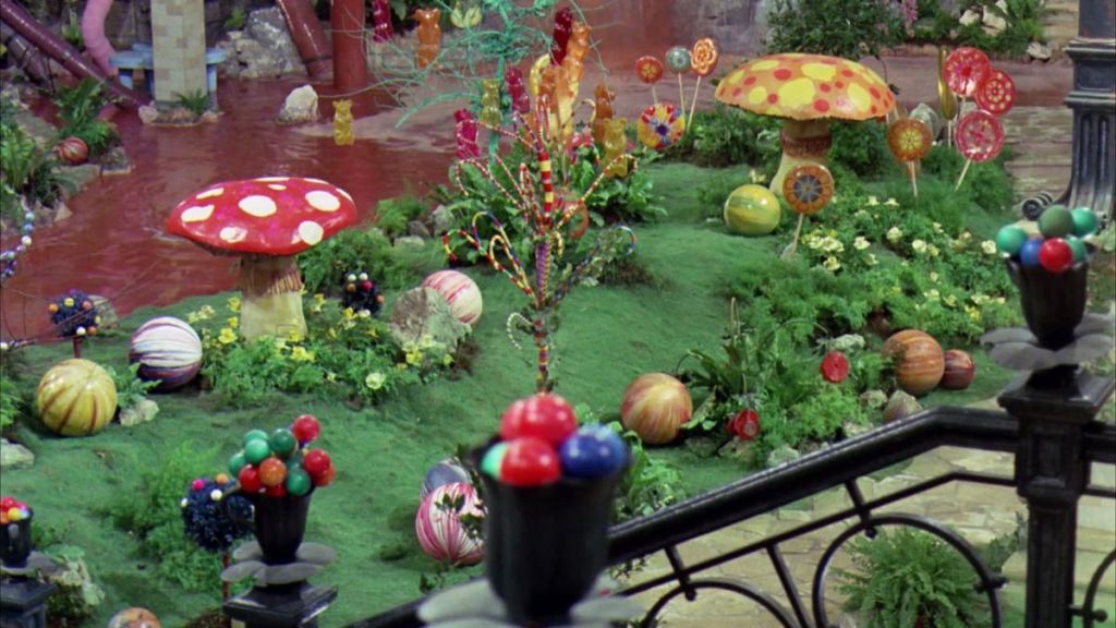 Au cœur des bosquets du jardin magique de Willie Wonka, chaque recoin dissimule un trésor de cacao qui ne demande qu’à être découvert. Ici, la nature se fait pâtissière : le gazon n’est qu’un tapis de pâte d’amande, les champignons de tendres biscuits, et les fleurs des parures de sucre aux mille parfums. Et lorsque tu choisiras de te désaltérer à la source de chocolat, fais-le avec une liberté souveraine ; car dans ce royaume de délices, ni le poids des années ni l’aiguille des balances ne sauraient entraver ta gourmandise.