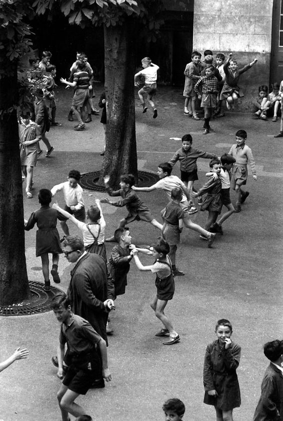 Plan large, en plongée sur la cour braillarde, pendant la récréation de 10 heures.