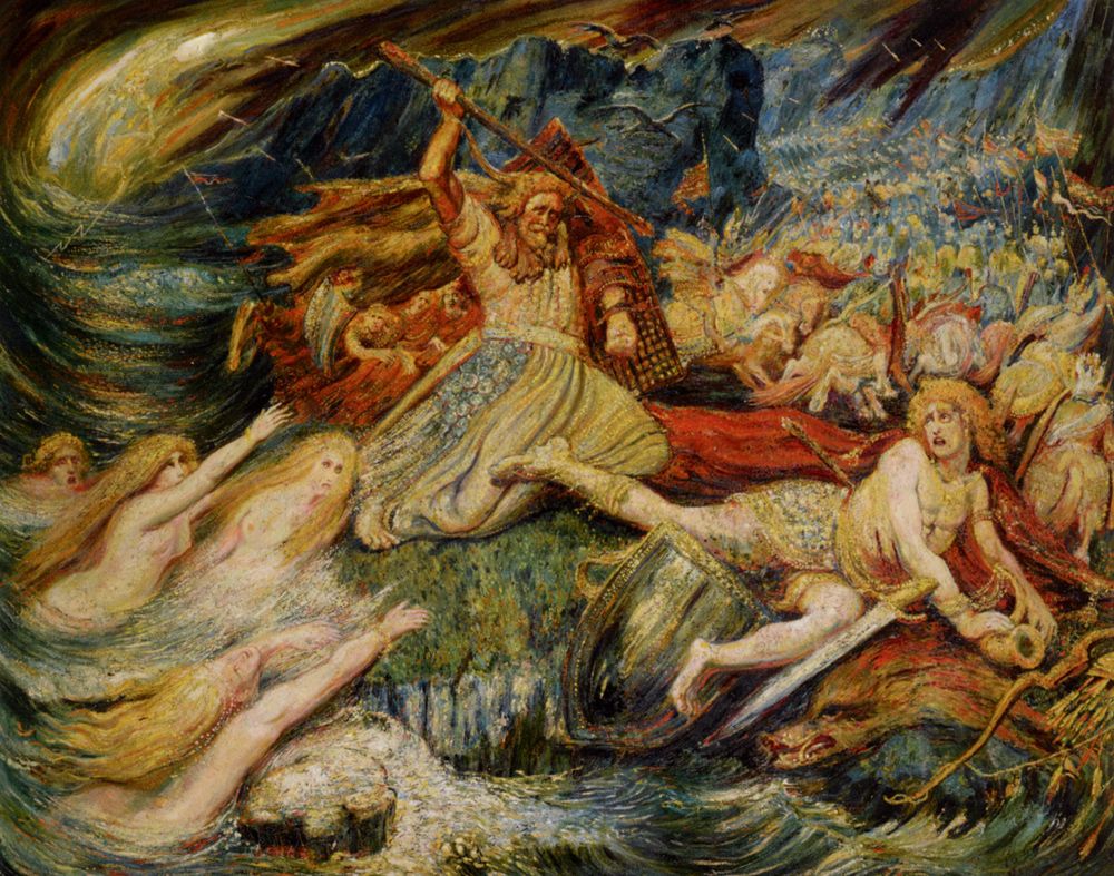 Baumann, gendre du peintre, décrit ainsi la scène en 1936 : « les filles du Rhin, les bras tendus, désespérées, jaillissant des vagues, ces belles vagues vertes que de Groux modelait comme des chairs de femme, mais impuissantes à sauver le héros vaincu, renversé […] tandis que Wotan assène en son flanc la lance de mort. » (Extrait du catalogue ARCURIAL – Vente « Éloge du symbolisme » – 26/09/2017)