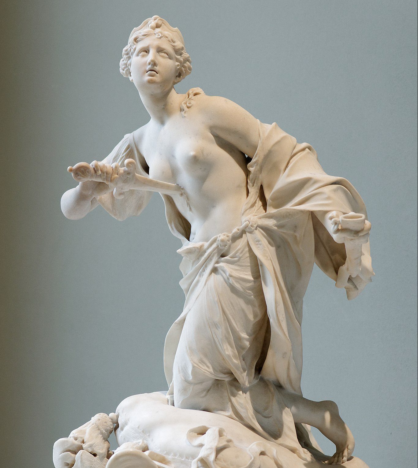Ainsi avait parlé Didon, et avant qu’elle n’achève, ses servantes la voient retombée sur le fer, l’épée couverte d’une écume de sang, ses mains sans vie.