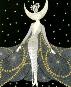 A l’instar de cette silhouette d’Erté, dessinateur de mode fort apprécié à la période Art-Déco, entre Paris, Broadway et Hollywood, la « Reine de la nuit » de « La Flûte Enchantée » a toujours occupé la scène debout, drapée dans de somptueuses robes, majesté hautaine aux traits durcis par l’incarnation du mal qu’elle est censée représenter, affirmant au premier regard et le dédain qu’elle nourrit pour le monde de la lumière et la supériorité du royaume des ténèbres qu’elle personnifie.