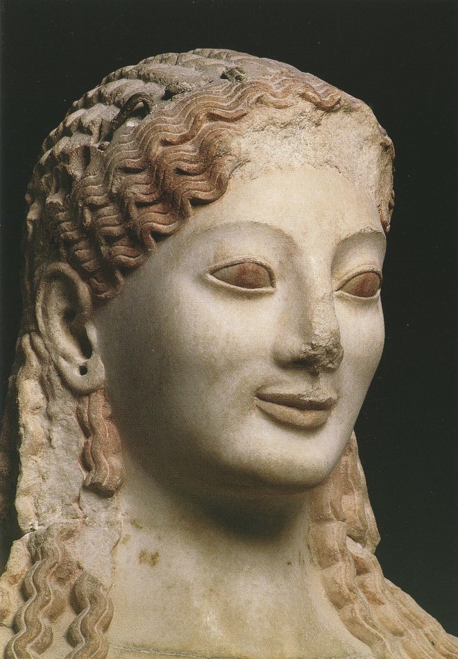 Maxime se leva et se mit naturellement en marche vers la maison. Mais après quelques pas, il laissa tomber son cartable vide à ses pieds, se retourna vers la vieille dame et se précipita dans ses bras en courant. Ils s’enlacèrent l’un l’autre tendrement ; Maxime étreignait sa vénérable compagne de l’après-midi de toutes les forces ingénues de son enfance pendant que celle-ci gratifiait le garçon d’un profond sourire de korè, ce « sourire de l’amour » qui illumine les beaux visages de ces statues grecques archaïques que « nous aimons d’une tendresse qui ne peut s’épuiser », selon le mot d’Élie Faure, passionné d’art, qui les a tant fréquentées.